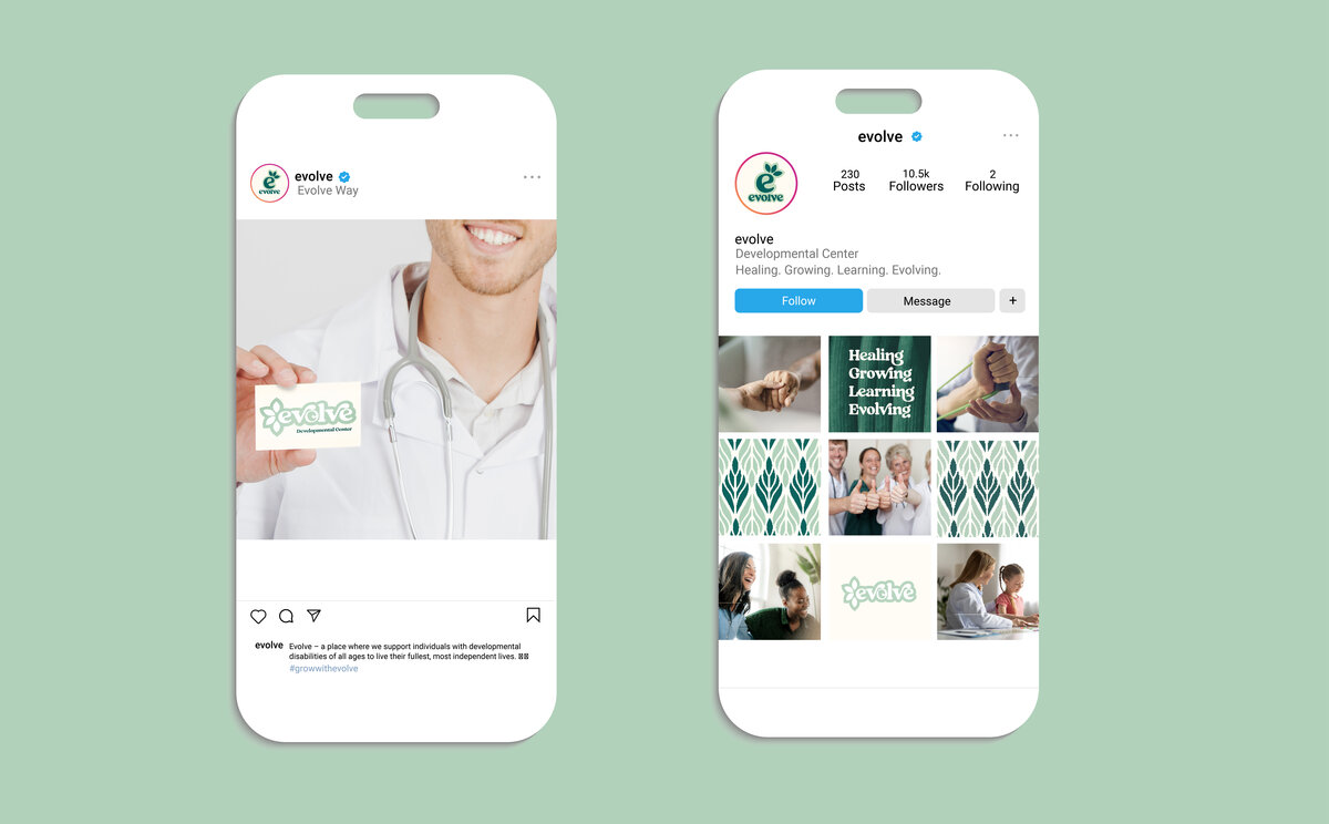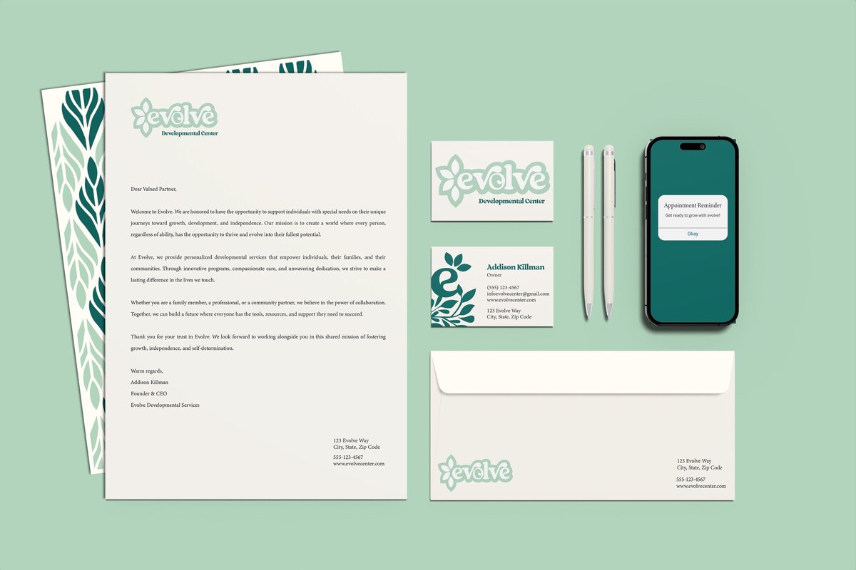 Evolve is a conceptual brand identity I created for a fictional developmental center that provides mental, physical, and speech therapy under one roof. Designed from the ground up, this project explores how visual identity can communicate calmness, growth, and accessibility. Through research, iteration, and a nature-inspired design system, I developed a cohesive brand experience tailored to support individuals and families seeking developmental services.