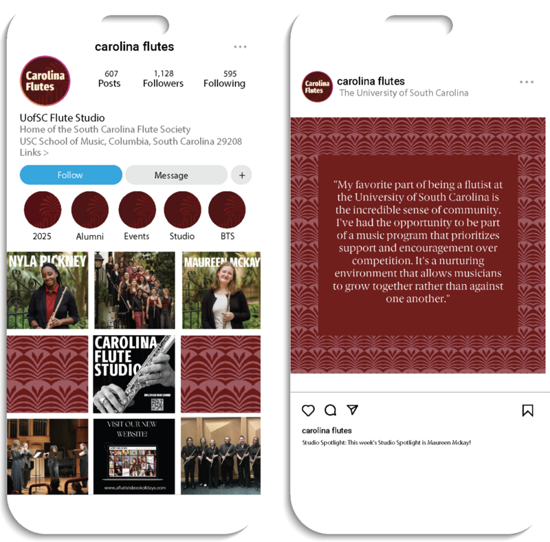 This project focused on building a cohesive visual identity and communication strategy for the USC Flute Studio. The goal was to make the studio feel more welcoming, connected, and recognizable to current and prospective students. We developed a full social media branding system, a weekly content plan for consistent posting, headshots and portraits to introduce the people behind the studio, and postcard designs for outreach to admitted and prospective students. Together, these materials create a unified presence across digital and print platforms and help the studio reach a broader audience in a warm and approachable way.